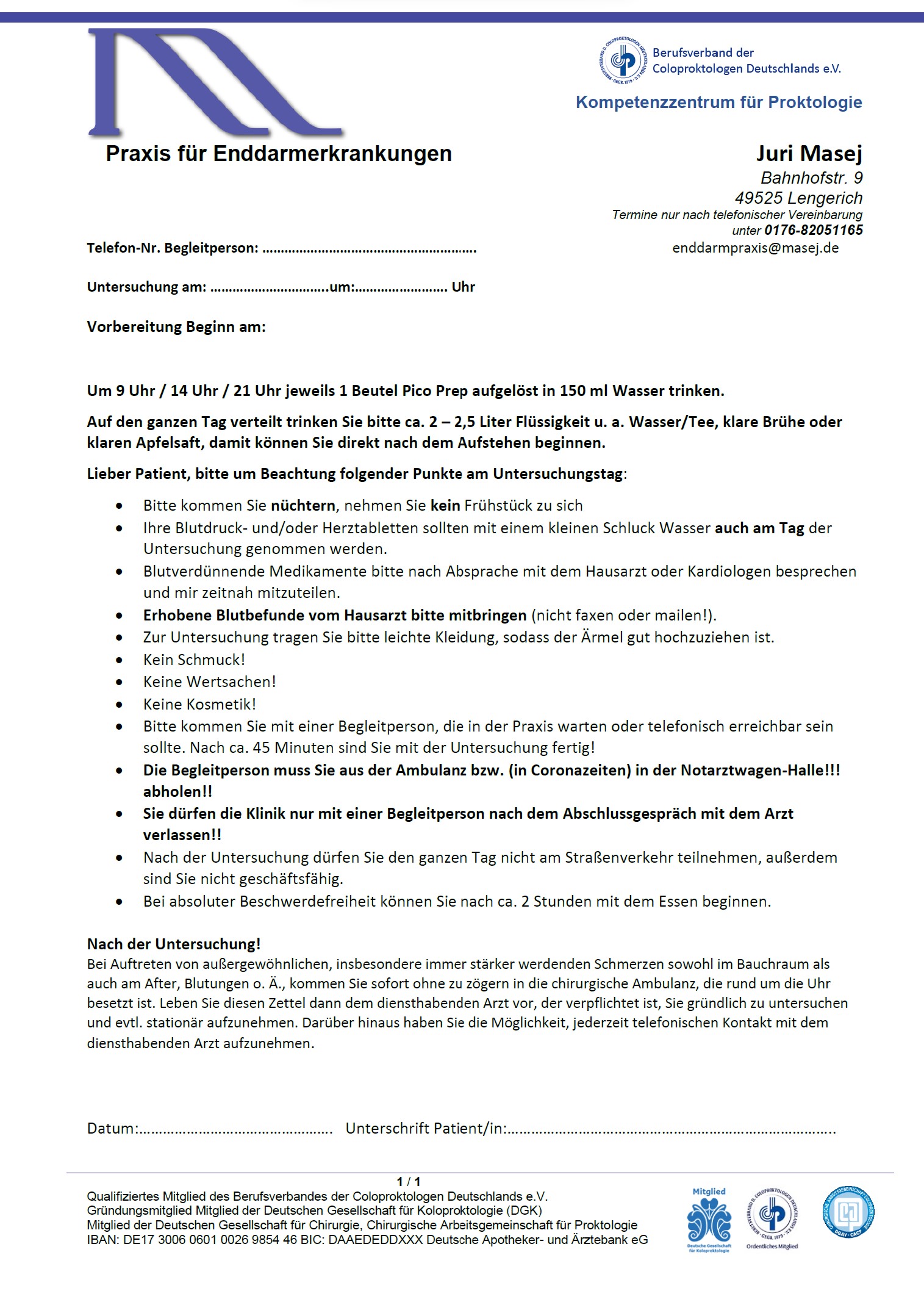 Wenn für Sie ein Termin zur Coloskopie vereinbart ist, können Sie hier das Formular für die Vorbereitung herunterladen. Klicken sie dazu auf den unten stehenden Link (neben "Anhänge herunterladen"), und speichern Sie das Formular auf Ihrem PC oder Mobilgerät. Drucken Sie es dann aus und bringen es ausgefüllt mit zu Ihrem Termin.