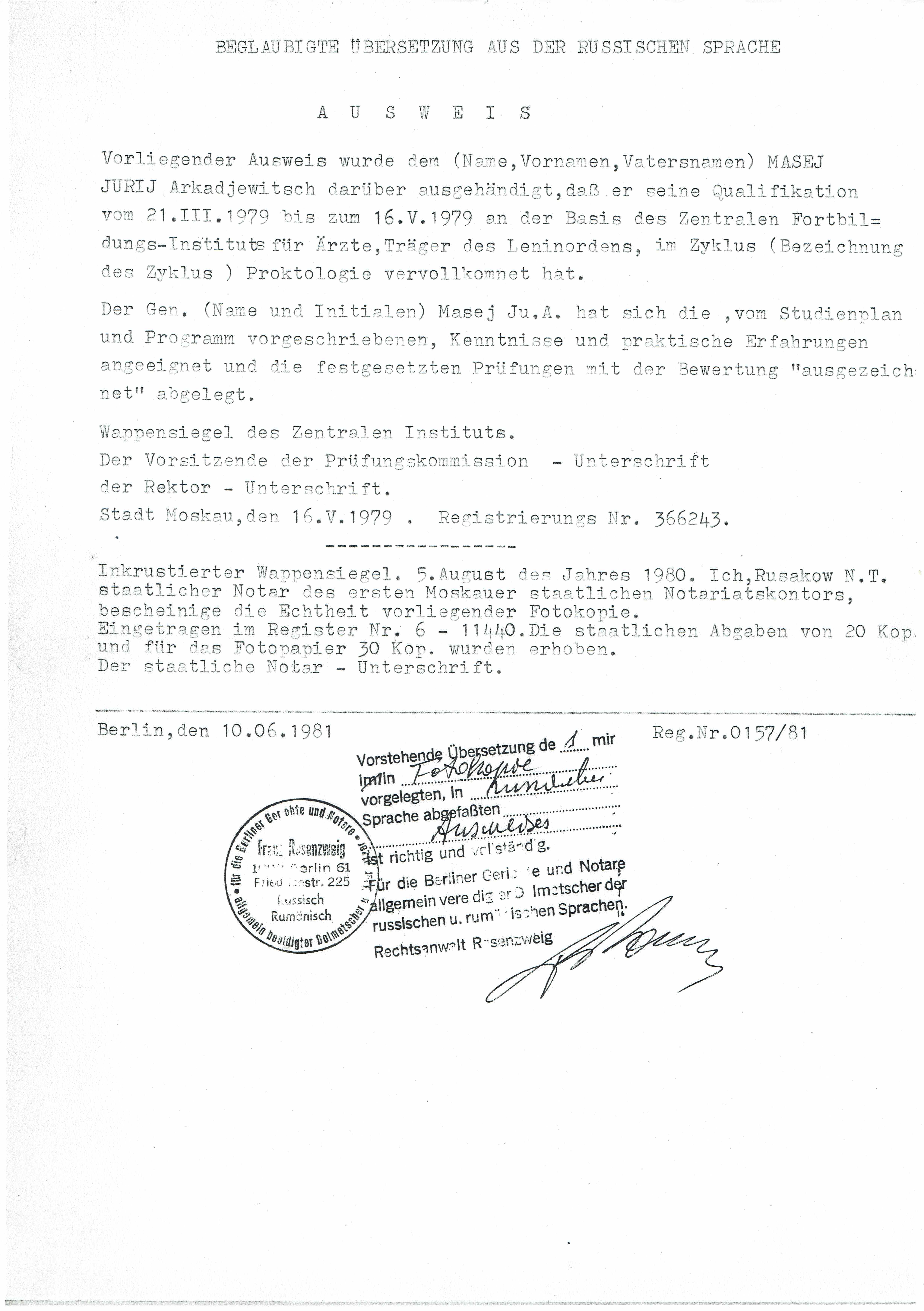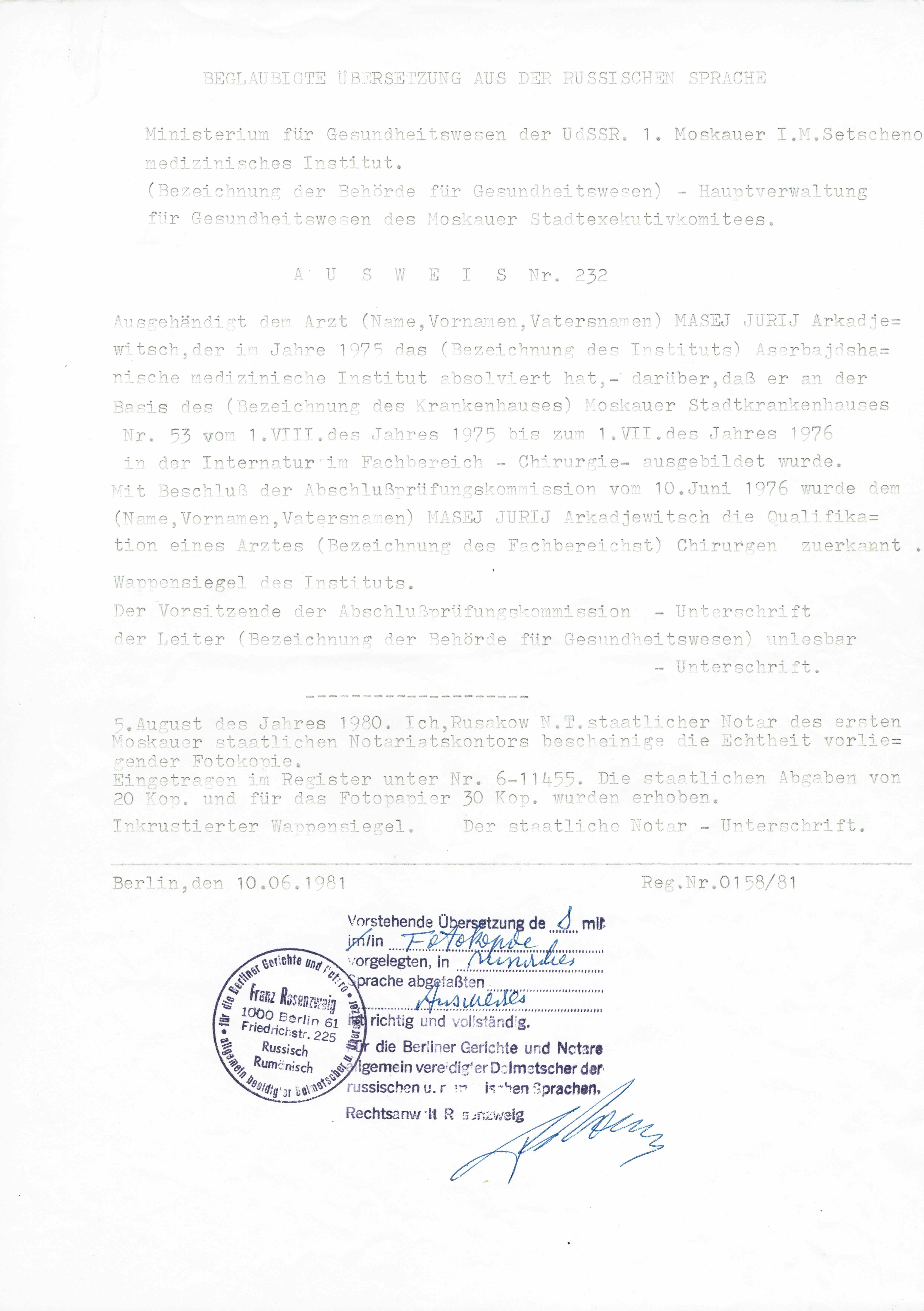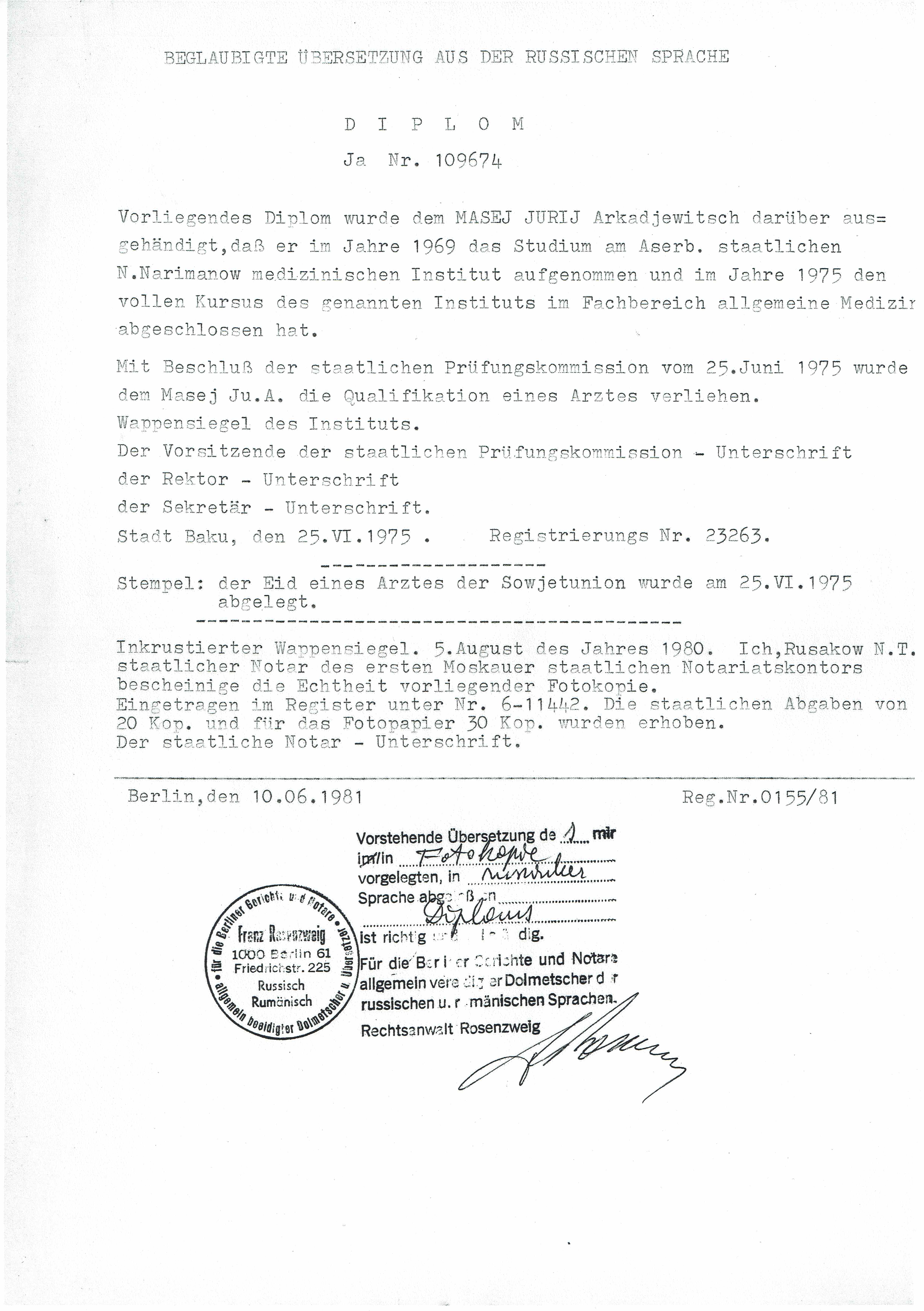 Übersetzung - Arztdiplom 1969-1975 Übersetzung - Arztdiplom 1969-1975