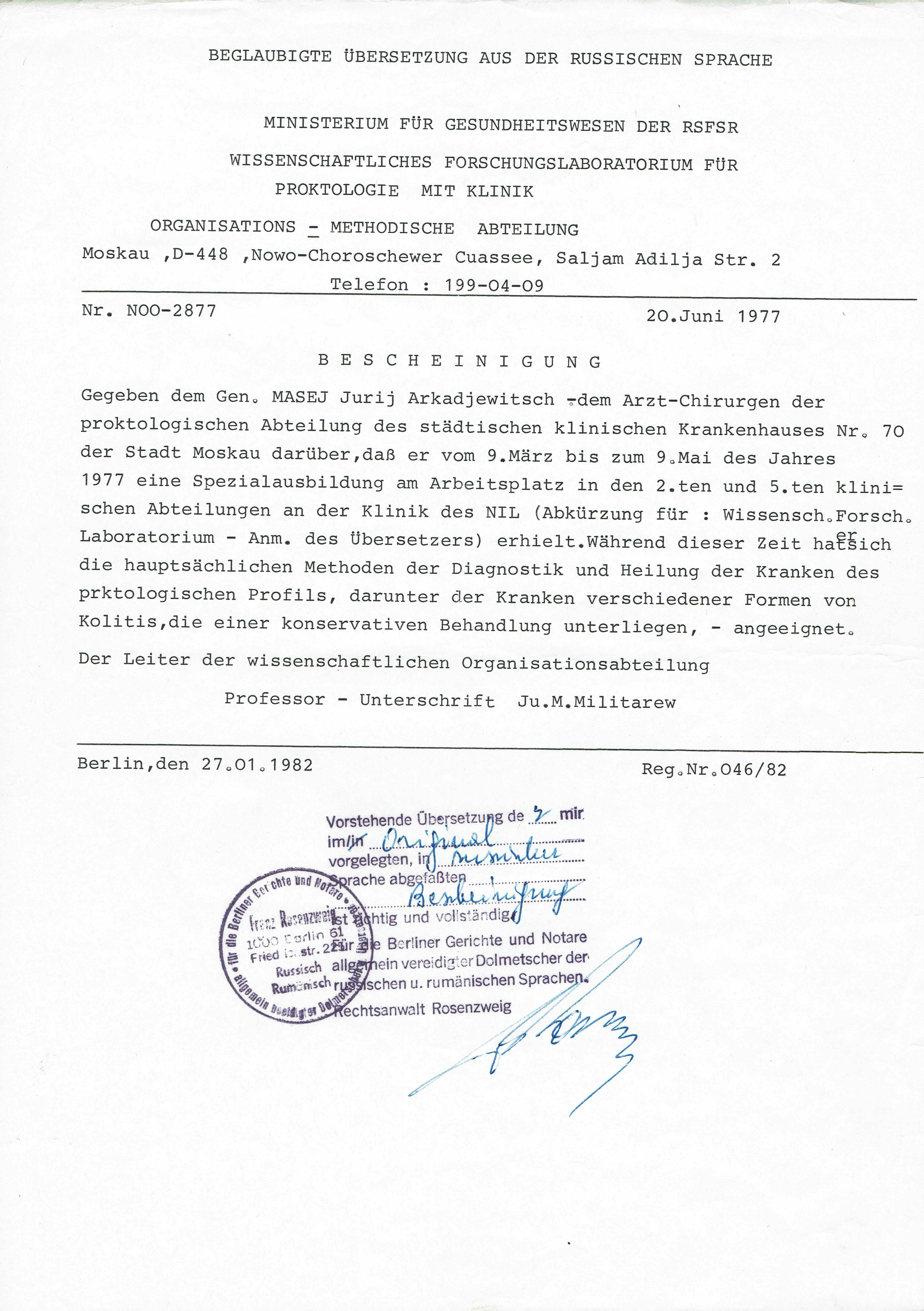 Übersetzung - Abschluss der proktologischen Weiterbildung am Institut für Proktologie in Moskau mit Prüfung Übersetzung - Abschluss der proktologischen Weiterbildung am Institut für Proktologie in Moskau mit Prüfung